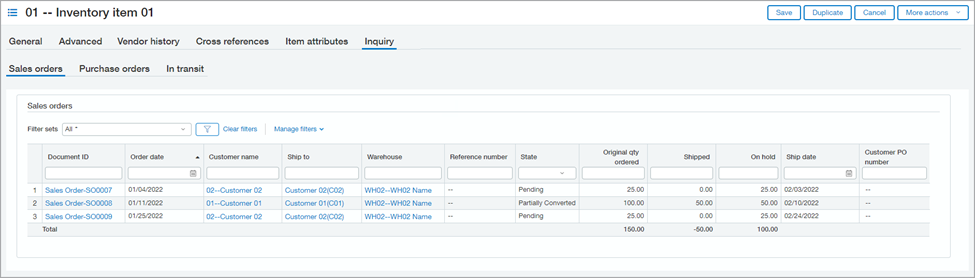 With Intacct 2022, you get even more visibility into what's goin on with an inventory item directly within the item record. Depending on the configuration of your company, up to three tabs now appear on the Inquiry tab including: