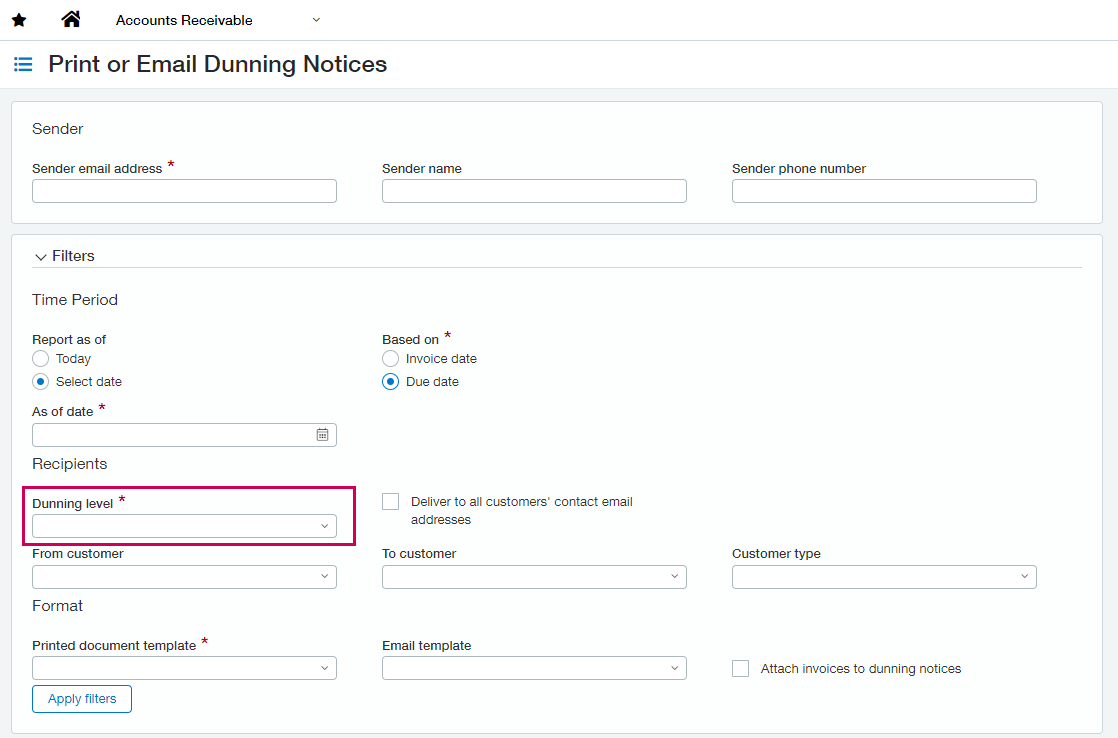 Notices process in Sage Intacct 2022 R2. You can now configure Intacct with custom dunning