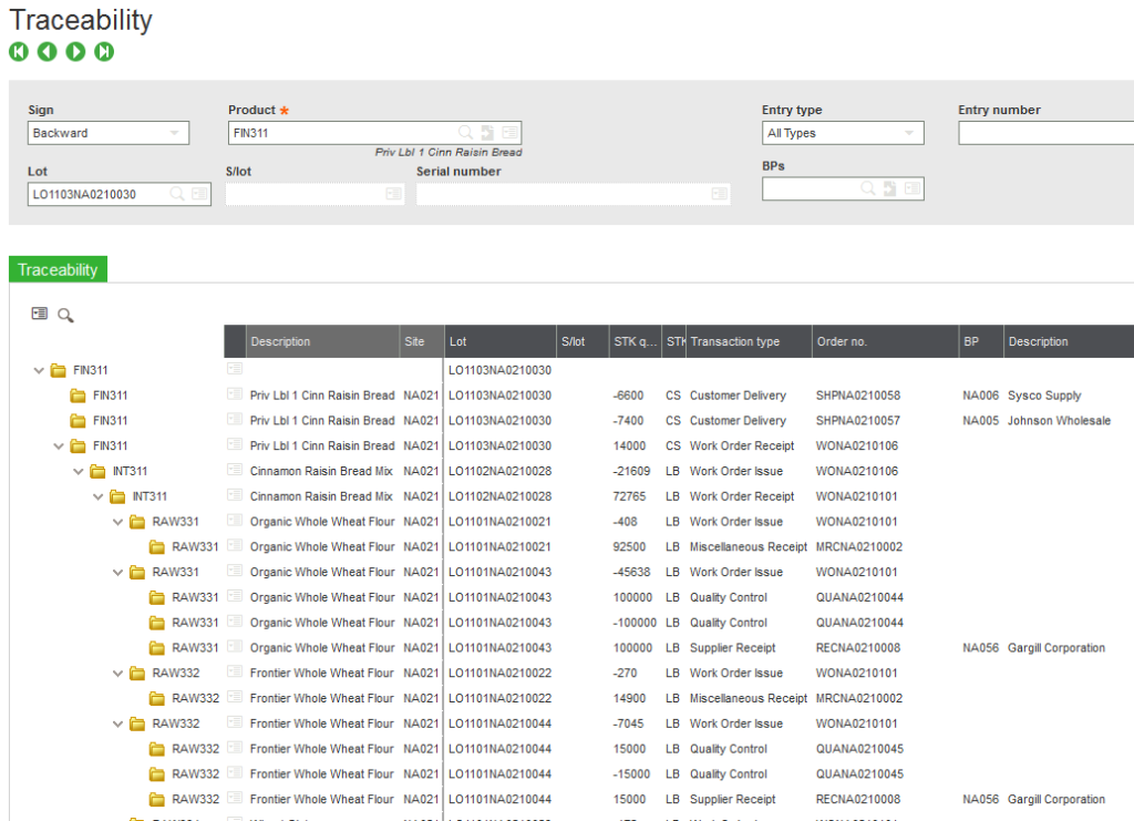 With an ERP solution, you can collect real time data to target the affected product and quickly execute a resolution. Once a lot number has been identified you can trace forward or backward to determine what products have that ingredient, as well as how many were made and the locations. Below is a screenshot of traceability of an ingredient within Sage X3.