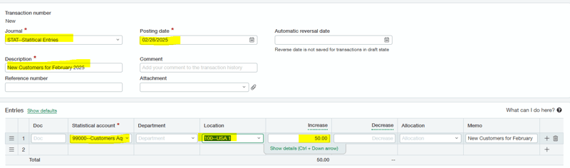 Step Two: Create statistical journal entry to track customers added for the month. In some cases, this process can be automated using a Smart Event. Please contact us for more details.