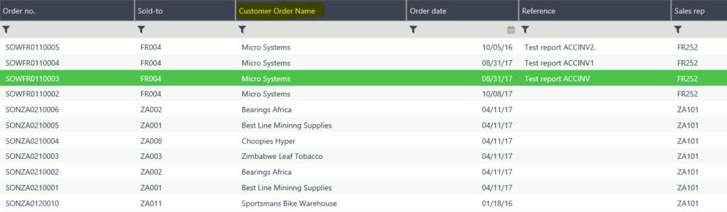 Now you can go back to the Sales Order Entry screen. You will now be able to see the newly added Customer Order Name column in the left list of sales orders.