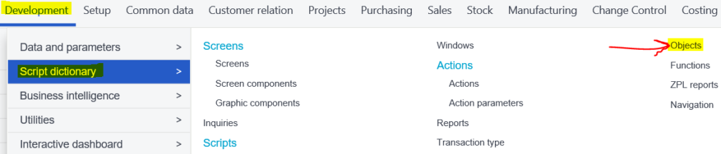 This is more of an enhancement to the base SAGE X3 instead of a customization. The first step is navigating to the Development tab in the mega menu at the top of the system. Development -> Script dictionary -> Objects.