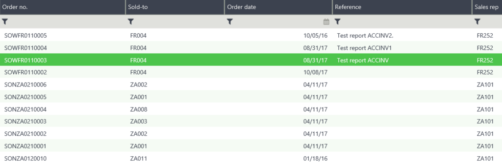 Below is the list of orders you should see on the left-hand side of the Sales Order entry screen. Let's add a Customer Order name field between the Sold-to and Order date fields.