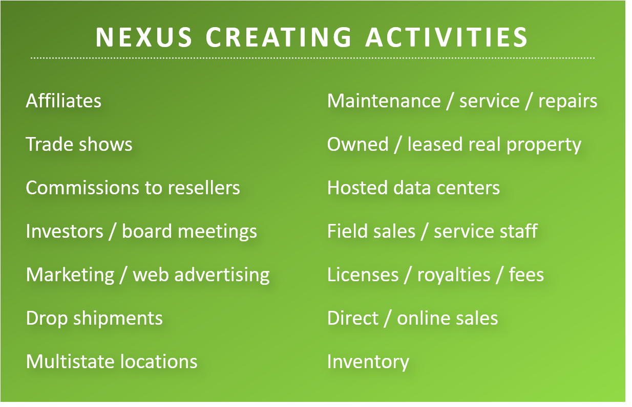 Two Nexus creating activities that are overlooked are tradeshow attendance and remote employees. Watch the webinar replay Nexus 101 to learn or contact RKL eSolutions to get a sample copy of a Nexus study.