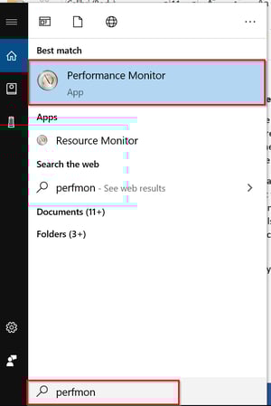 To launch Perfmon, type Perfmon into the windows search and the best match will be Performance Monitor.