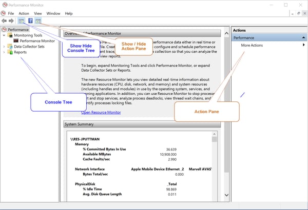 This is the system Summary page and it corresponds to clicking the root node, Performance, in the console tree. You can hide or show the console tree and the action pane using the corresponding tool bar buttons or using the View > Customize menu item. I typically keep the action pane hidden and will toggle the console tree as needed.