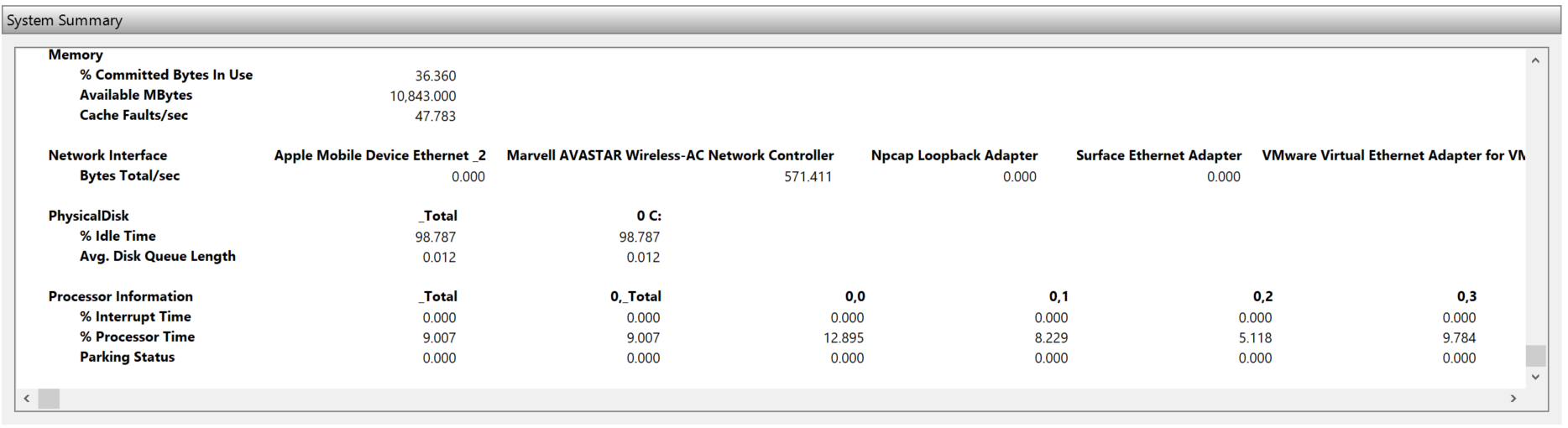 The system summary will show you the current value of counters that the Microsoft team thought were the most basic and important counters to look at. These are shown in the report view. Note that this is broken into the 4 major resource areas for a machine: Memory, Network, Disk and Processor.