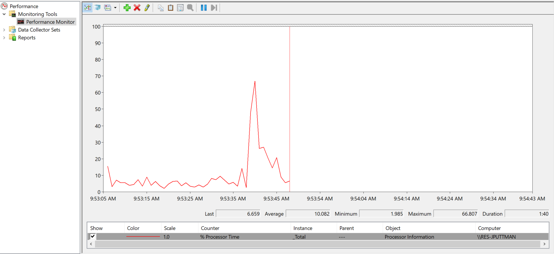 The report option is useful as it shows all the numerical values for all the selected counters. This can be really helpful when you have a lot of counters that you are understand at the same time.
