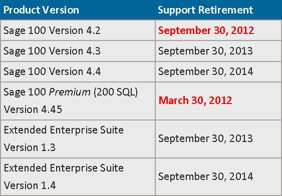 As a reminder, the following Sage 100 ERP version retirement schedule has been provided by Sage. Please note that support is no longer available for versions retired in 2012. Click Here for full support retirement details.