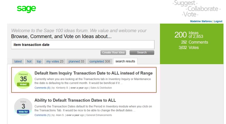 To learn more about the Idea Page: from the Sage 100 Information Page, the link is listed under Web Content. Set up your email and Password to vote on existing requests, or to add your own requests. https://www5.v1ideas.com/TheSageGroupplc/Sage100ERP/