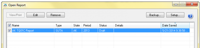 - History files give you access to prior reports that have been eFiled, printed for mailing, or saved. History may be accessed different ways depending on the accounting software but will always be accessed from the form selection window. Some examples of what the option to choose may be: "Saved Report", "Form Type: History", "Existing Reports".
