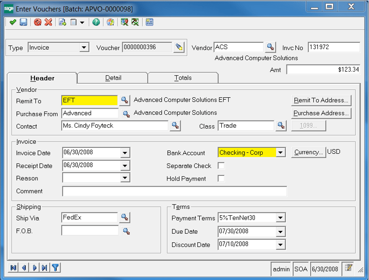 - At this point, newly created AP Invoices (aka Vouchers) for this vendor will default to the new EFT address and to the Payment method of EFT.
