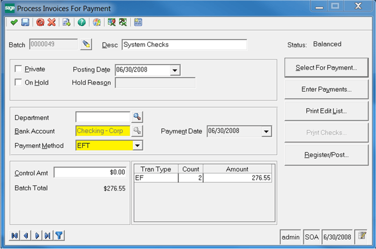 - When using the task Process Invoices for Payment, you can now utilize the same bank account for both check processing and EFT (aka ACH) by selecting the Payment Method of either Check or EFT on the main Batch screen. Note that you cannot intermingle the types within one batch.