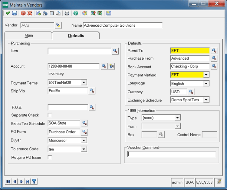 - Also on the Maintain Vendor Form / Defaults tab, set the Payment Method on the Defaults tab to EFT. This is important as only invoices that are set to this payment method will utilize ACH.