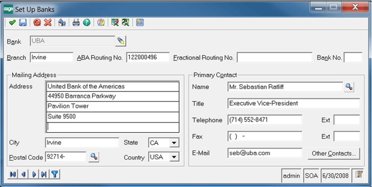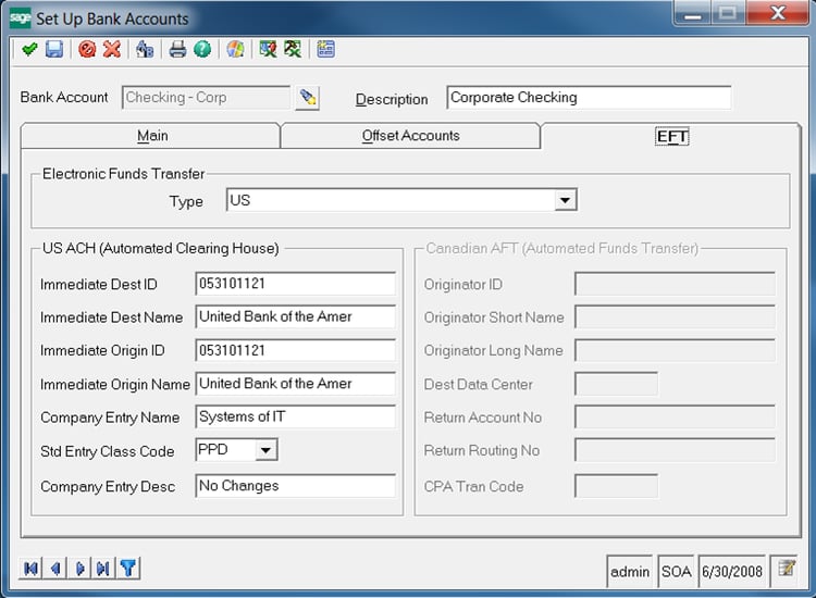 In some of the steps you will need to provide information that would be supplied by your bank. If your financial institution provides the ability to submit an ACH file then they should be able to provide you with the settings required to complete the ACH configuration in Sage 500 ERP. Typically, they will have a document that provides details on their requirements for ACH as well as a sample file that you can use as a reference when checking the ACH files produced from Sage 500 ERP.