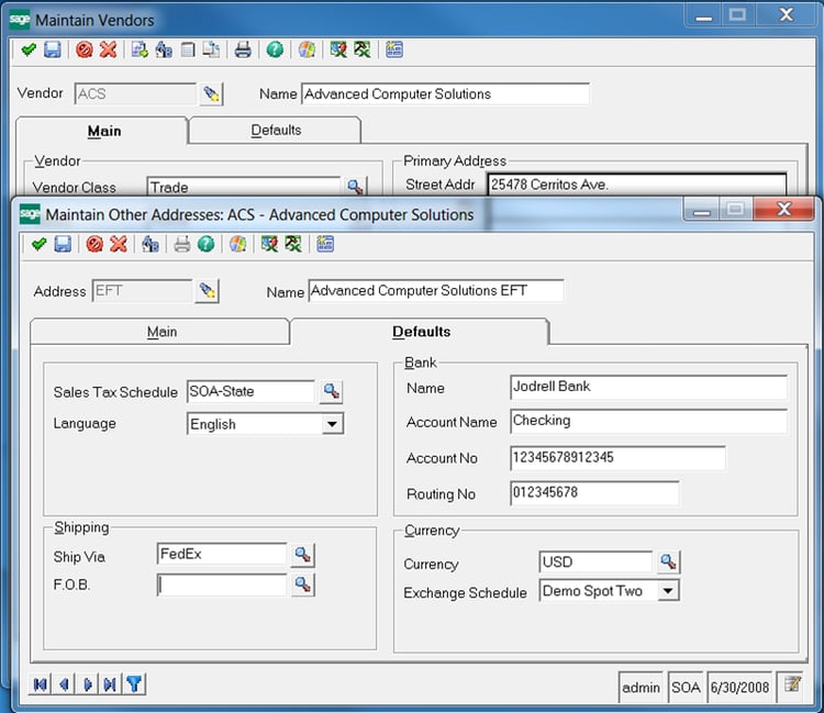 Figure 5: Update the Defaults on the Vendor to utilize the new EFT address as the default and set the payment method for this client to EFT.