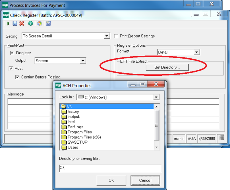 In the Register/Post form, be sure to set the directory in which you would like to create the ACH file export for this batch.