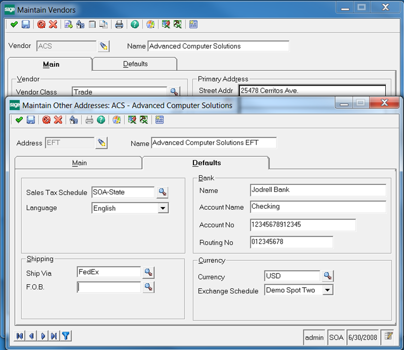- Setup a new address (the primary address cannot be utilized for ACH) using the “Other Addresses” form. You could call this “EFT” (or “ACH”) so that it is identified as the address used for the electronic funds transfer. Ensure that you complete the information in the Defaults tab of the Maintain Other Addresses form including Bank Name, Account Name, Account Number, and Routing Number that is provided by your vendor.