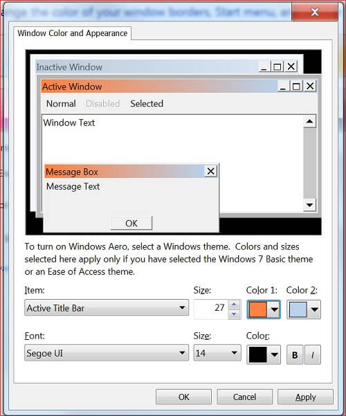 - Click on the "Advanced appearance settings..." hyperlink to see the “Window Color and Appearance” dialog