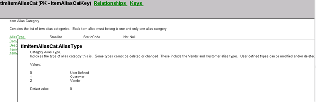 - timVendItemAliasCat – Contains a list of Item Alias Categories that can be used for Vendors. Use this for items with an AliasType of 2.