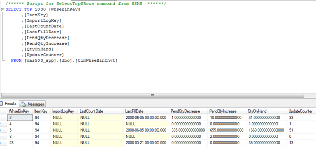 Using this data as an example, if we determine that itemkey 94 has no pending shipments or other entries to justify this pending quantity, we can go into timwhsebininvt and just set the pending columns to 0. This is not recommended because the pending quantity will just come back unless you fix the underlying issue. Every Sage 500 ERP installation loads a QtyOn job in SQL that serves to keep these pending quantities updating based on the transactions in the system: