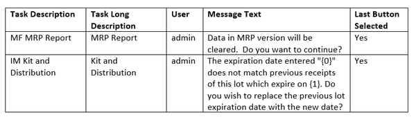 The follow table shows an example of the results of the above query after messages were suppressed for the admin user in the Sage 500 ERP database for the tasks shown above.