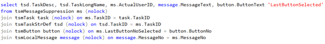 If a system administrator would like to review all Message Suppression in the system, they could do so by utilizing the below query seen in Figure 4. This will show all of the selections by each user and the related task and message that has been marked for suppression.