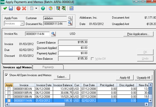 Now I select the other test invoice 1114 below to apply the overpayment. In this case I still have a balance but I have exhausted the overpayment from the original invoice.