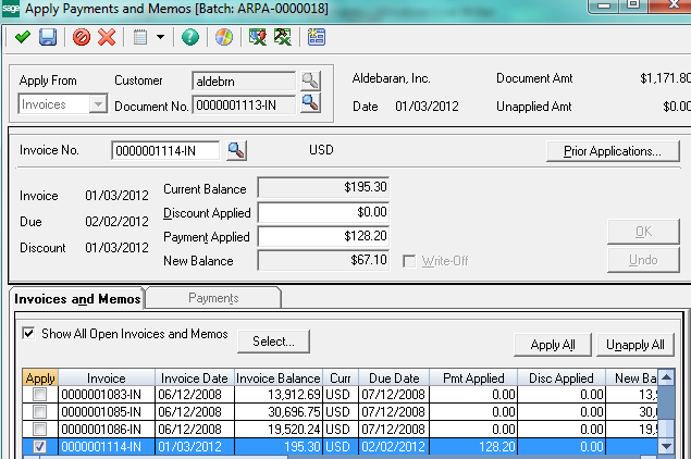 We can now select this invoice with an overpayment as shown below to use the unapplied amount to post against another invoice. Notice that I have select Invoices as my Apply From in order to select Document No. 1113.