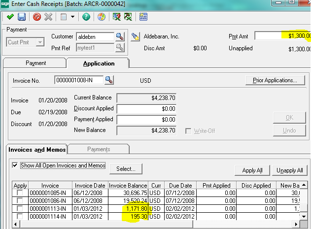 This post is not meant to be a full training on how to enter and post invoices and cash in Sage 500 ERP, it is just meant to provide an overview of the a feature recently added in version 7.4. This will describe the new AR Invoice Payment functionality of Sage 500 ERP v7.4. This new functionality allows over-payment tracking by invoice instead of lump sum. This provides more accurate tracking of the overpayment at the invoice level for reconciliation. In addition to the tracking it also adds the ability to apply this overpayment to a balance on another invoice.