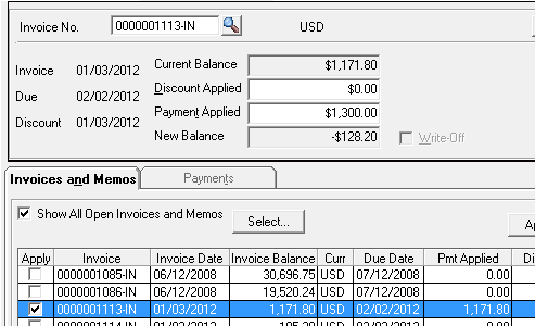 Now I enter a payment of $1,300 from the same customer I had the invoices for. The customer references invoice 1113. So I only want to apply this payment to this invoice even though it appears to overpay this balance.