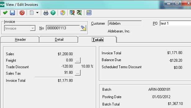 I have entered 2 invoices in this scenario for the same customer. Here is the summary of those 2 invoice amounts in the Invoice Batch. I posted this batch.