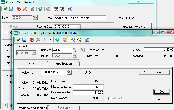 Now I register and post this batch. This makes this record permanent. My next step is to create another batch with a another payment for Aldebrn of $135, as shown below. As you can see by entering in the Invoice No 1113 and then pressing the Tab key key it retrieves the invoice information showing the current balance of –$150. I then key in the Payment Applied of $135 as mentioned by Richard Sisk and it now brings the value of the new balance to –$285.
