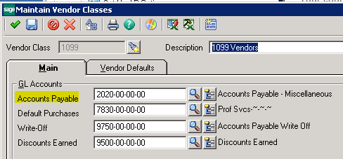 For non-inventory items (Miscellaneous, Expense, and Services) the accounts are defined in Common Information > Maintenance > Maintain Non-Inventory Items, and the defaults for these accounts come from Maintain Non-Inventory Item Classes.