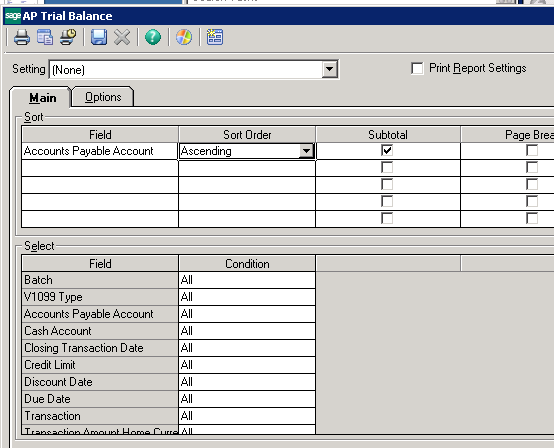 On the Main tab, Subtotal by “Accounts Payable Account” and be sure not to enter any filters in the Select grid.