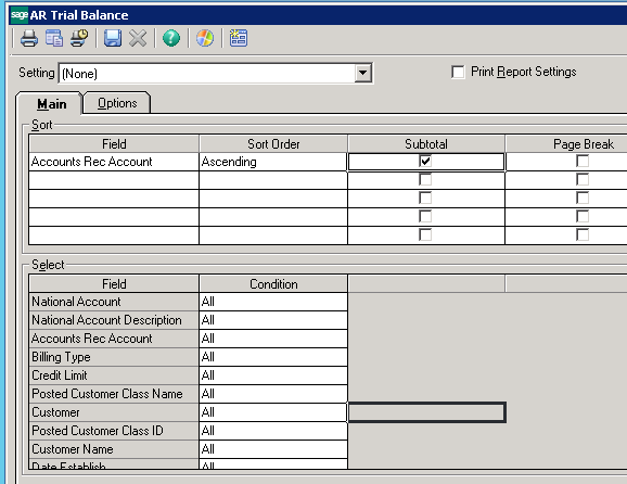 On the Main tab, Subtotal by “Accounts Rec Account” and be sure not to enter any filters in the Select grid.