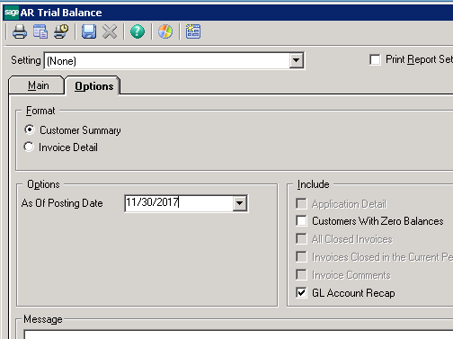 The Aged Receivables Report can also be used but make certain you choose on Options “InclusionDate – Posted On or Before”. Note that if you use The Aged Receivables Report it does not have the GL Account Recap shown below.