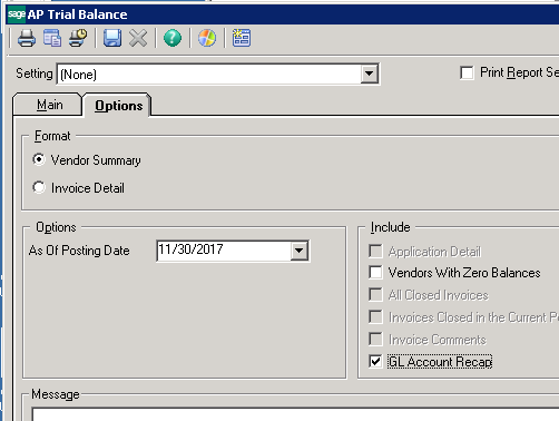 The Aged Payables Report can be used but make certain you choose on Options “InclusionDate – Posted On or Before”. If using the Aged Payables Report note that it does not have the GL Account Recap shown below.