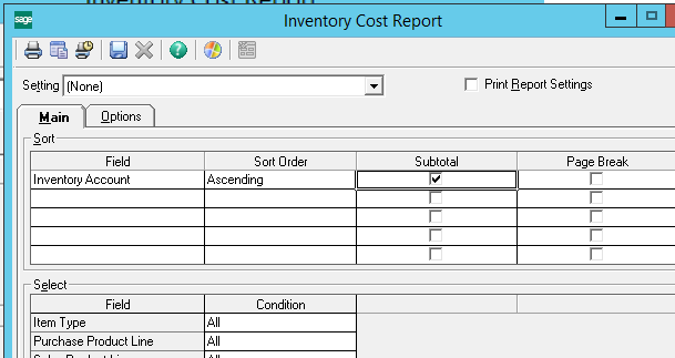 Use the Inventory Cost Report as the basis for reconciling your Inventory to your General Ledger. On the Main tab, Sort and Subtotal by “Inventory Account” and be sure not to enter any filters in the Select grid.