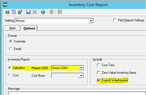 On the Options tab, select the “Valuation” option and the “Stock UOM”