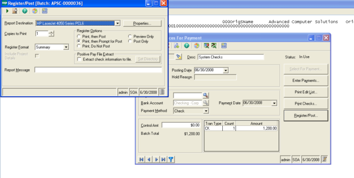 - Click on ‘Register/Post’ button. A new ‘Extract check information file’ checkbox will appear at the bottom right corner of the ‘Register/Post’ screen under the heading ‘Positive Pay File Extract’. (See Figure 2)