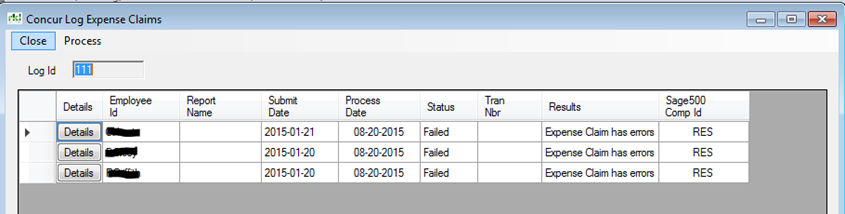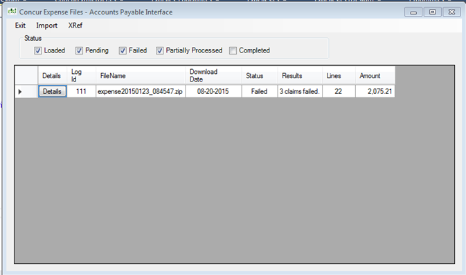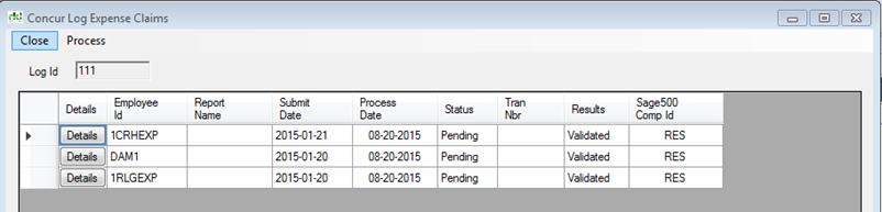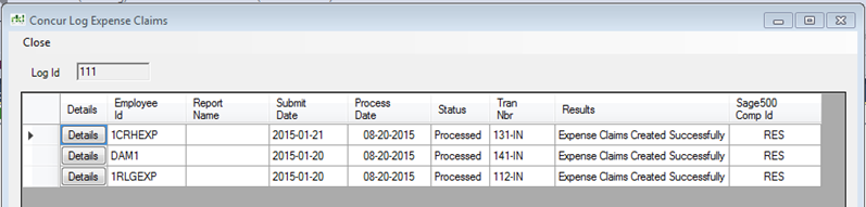 The details window will display all Expense Reports in this batch, along with the Results. If the claim had errors, click on the "Details" button next to the claim to edit the errors.