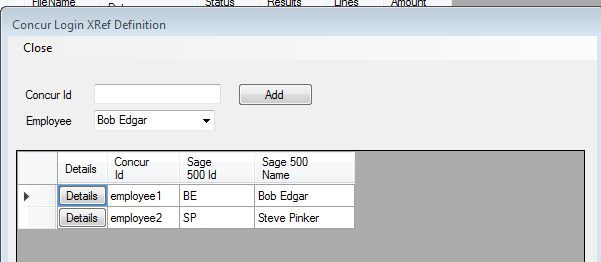 In some cases, the employee IDs in Concur may not match up directly to a vendor or resource in Sage 500 or Sage X3. In this case, a cross-reference can be set up to point a Concur employee ID to a valid vendor or resource. If the concur employee IDs map directly to a vendor or resource, there is no need to set up a cross-reference record.