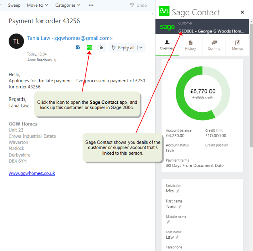 For example, suppose you're heading out for a customer visit and want to make sure you're up to date on the status of their account. Rather than calling in to the office and have someone in accounting run a report and get back to you, you can simply use Sage Contact to open a recent email to or from the customer and select the Sage Contact icon to display the info on your device.