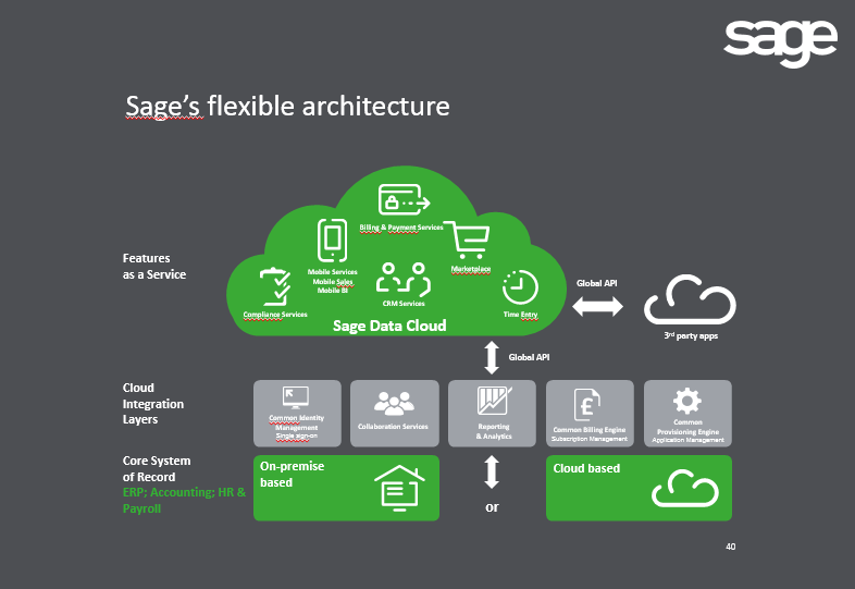 Sage Data Cloud is technology that acts as a hub - or bridge - that connects your Sage ERP system to a whole new world of mobile applications, software, and services delivered from the cloud. As seen in the diagram, it enables data and transactions to flow freely, and synchronize, between the cloud and your on-premises Sage accounting system.