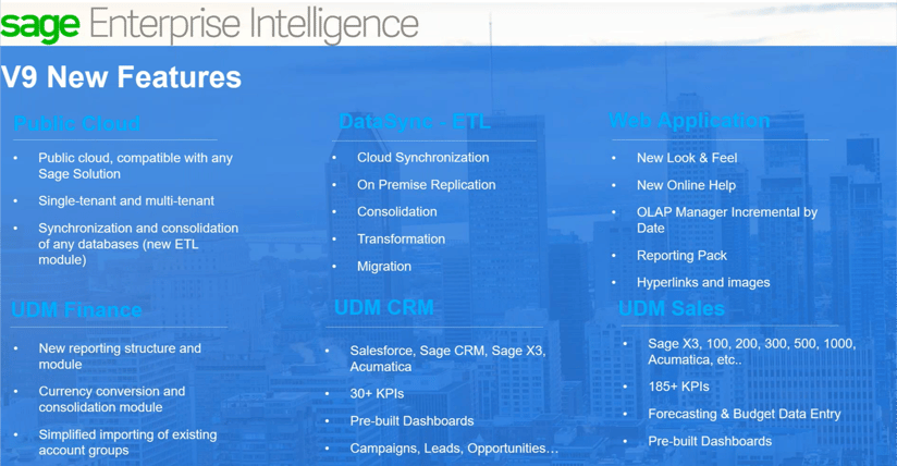 Sage Enterprise Intelligence launched v9 in March. The user interface (web client) for desktop and mobile has been redesigned for version 9. The current version released by Sage is 9.2.6791. The layout has changed, a new look & feel and some terminology changed like processes are now called data models.