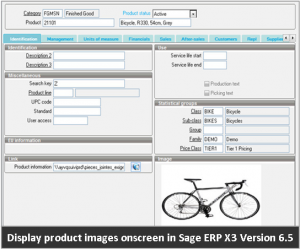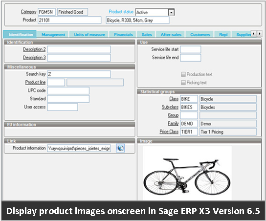 Product records in Sage ERP X3 6.5 also provide a field for including links to product images, external websites, and supporting documentation like product specifications or assembly instructions. These are all potentially important tools that are made available onscreen so your customer service representatives have access to these documents while they're interacting with customers.