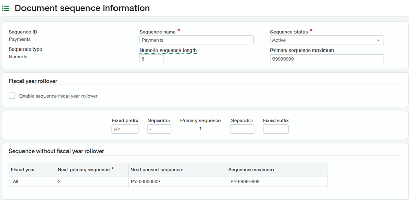 Navigate to Accounts Receivable > Setup > Configuration> Document sequencing. Toggle the “Payments” drop-down and select the document sequence created in the previous step.