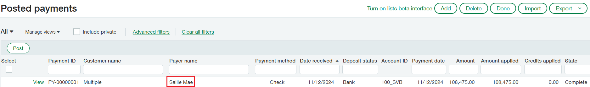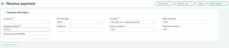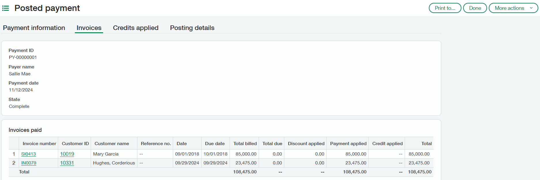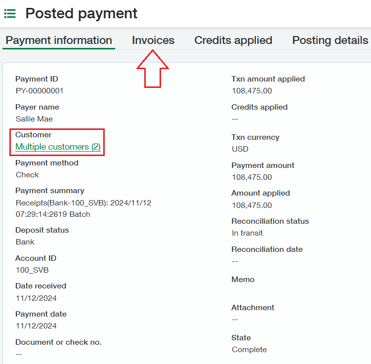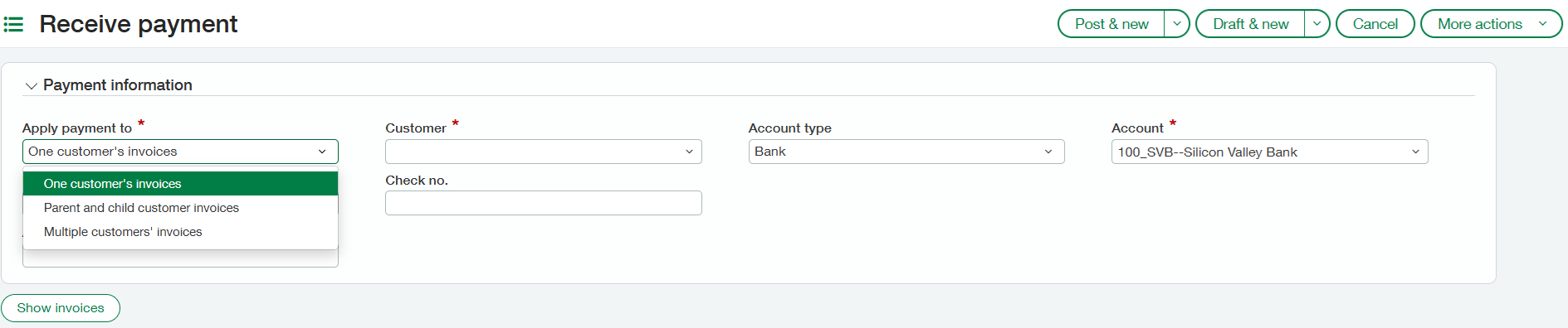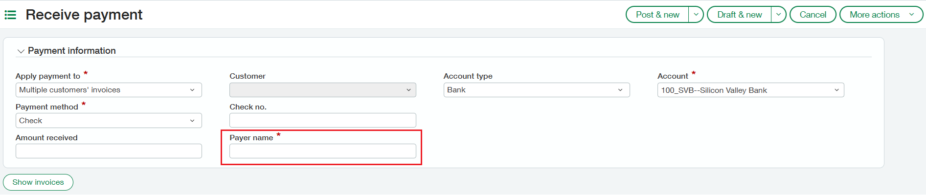 - When you select Multiple customers' invoices, enter the payer name for the payment. You can apply the payment to any open invoices.