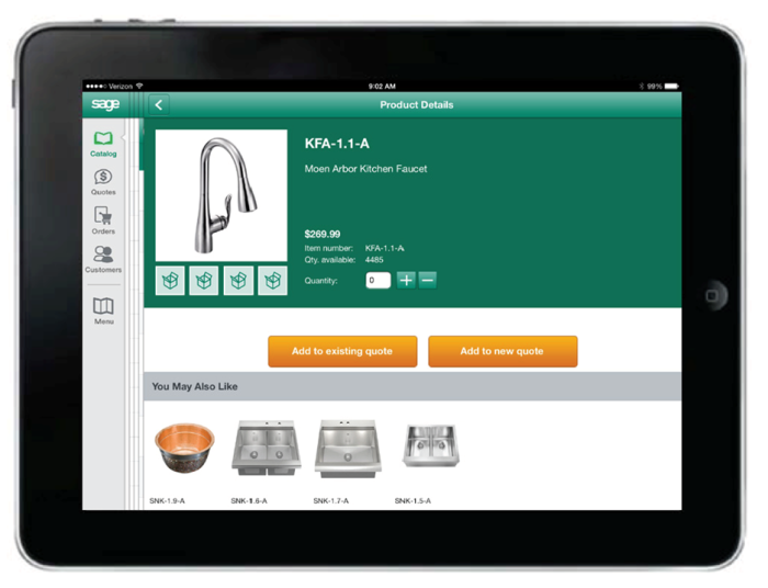Add new customers and place orders anytime, anywhere with Sage Mobile Sales. This iPad app connects your sales team to an online catalog that tracks inventory in real-time, provides vivid product photos, suggests substitutions when you’re out of stock, and populates related items to create cross-sell opportunities. With Sage Mobile Sales, your team has access to the ERP data they need to stay productive - in the office or away.